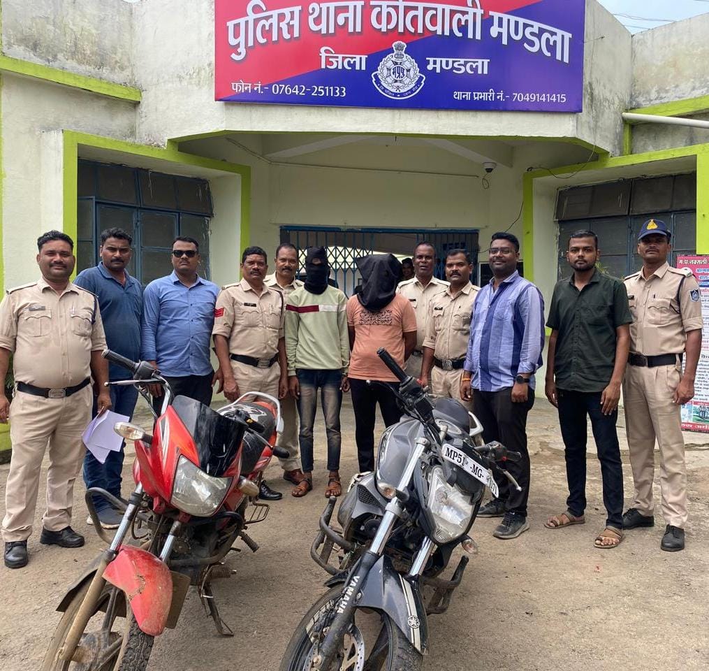 मंडला जिले की थाना कोतवाली पुलिस टीम ने बाइक चोरी के दो आरोपियों को गिरफ्तार किया है। आरोपियों के पास से दो बाइक बरामद हुई हैं। ये बाइक कोतवाली थाना क्षेत्र के लाल बहादूर शास्त्री वार्ड और अक्षरधाम कालोनी से चोरी हुई थीं। पुलिस ने दोनों आरोपी रोहित (29) पिता स्व. सुरेंद्र ठाकुर निवासी चर्राटोला थाना बिछिया और भावेश पिता स्व. रामसेवक झारिया निवासी जिला डिंडोरी को गिरफ्तार कर न्यायालय के समक्ष प्रस्तुत किया है।