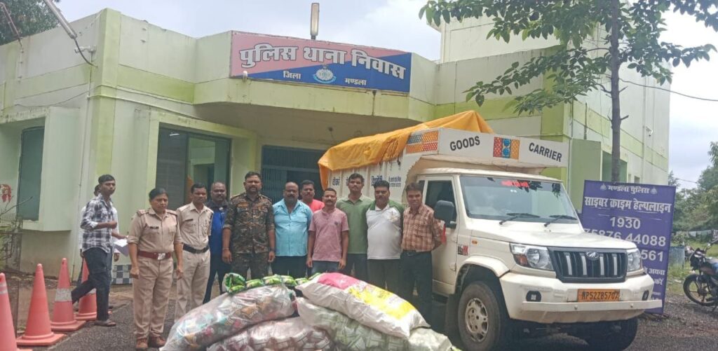 मण्डला। थाना निवास पुलिस ने अवैध शराब तस्करी के विरुद्ध कार्यवाही करते हुए बड़ी मात्रा में अंग्रेजी शराब तथा परिवहन में प्रयुक्त पिकअप वाहन जप्त किया है। दो आरोपियों को मौके से गिरफ्तार कर उनके विरुद्ध आबकारी अधिनियम के तहत मामला दर्ज किया गया है। 12 जुलाई की रात मुखबिर से सूचना प्राप्त हुई कि एक पिकअप वाहन एमपी/52/जेडबी/5707 जबलपुर से निवास होते हुए डिण्डौरी की ओर जा रहा है जिसमें कुरकुरे के बंडलों के नीचे बड़ी मात्रा में शराब छुपाकर परिवहन की जा रही है। सूचना को गंभीरता से लेते हुए थाना प्रभारी निरीक्षक वर्षा पटेल के नेतृत्व में पुलिस टीम गठित की गई। पुलिस टीम द्वारा ग्राम खड़देवरी भीखमपुर तिराहा निवास जबलपुर मार्ग पर घेराबंदी कर संदिग्ध वाहन को रोककर वाहन की तलाशी ली गई जिसमें कुल 39 पेटी अंग्रेजी शराब बरामद की गई। इसमें 15 पेटी एमडी रम थीं जिनमें कुल 129.6 लीटर शराब पाई गई। वहीं 24 पेटी जिनियस ट्रिपल एक्स रम से 216 लीटर शराब मिली। कुल बरामद शराब की मात्रा 345.6 लीटर रही जिसकी अनुमानित कीमत 2,77,200 है। परिवहन में प्रयुक्त पिकअप वाहन की अनुमानित कीमत लगभग 10 लाख है। वाहन में सवार दोनों आरोपियों गगन बनवासी पिता समारू बनवासी उम्र 34 वर्ष तथा सुकाली बनवासी पिता जवाहर बनवासी उम्र 25 वर्ष दोनों निवासी ग्राम देवरा थाना डिण्डौरी को मौके पर गिरफ्तार किया गया।